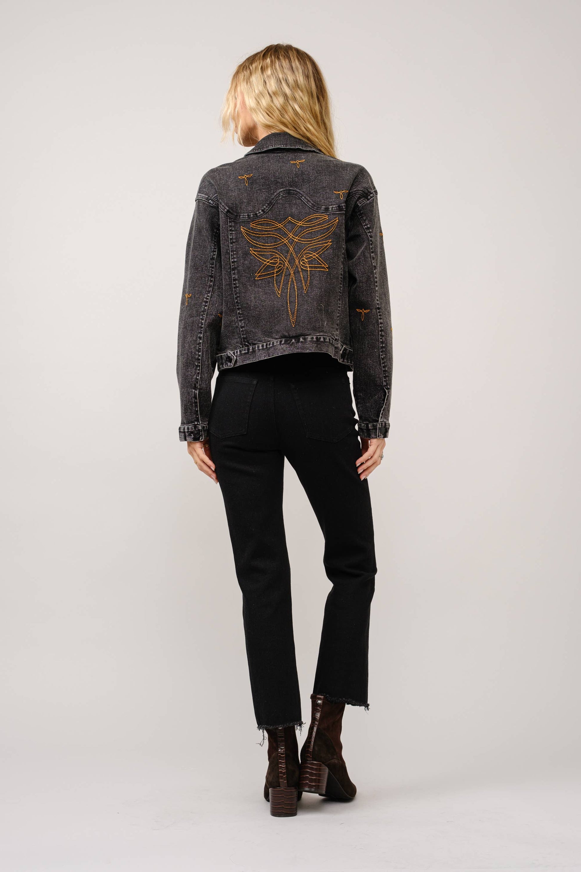 The rugged denim trucker jacket is cut for an eased, layer-ready fit from well-washed cotton denim with all over boot stitched western mark.