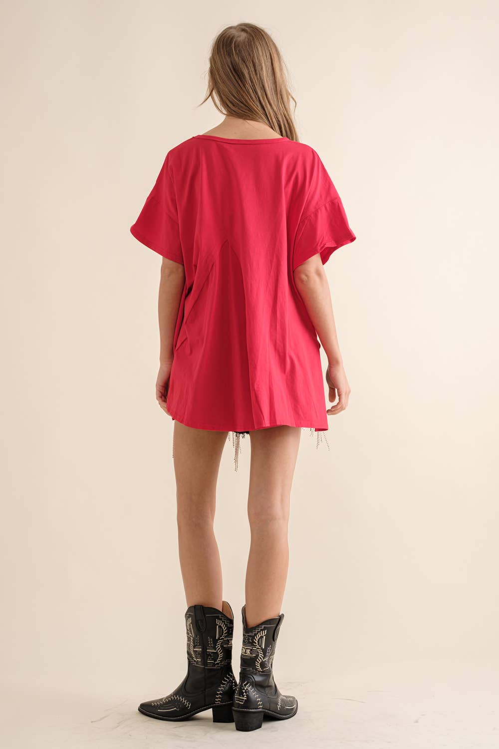 Cotton Sequin Western Boot Fringe Loose Side Slit Slash Back Graphic T Shirt